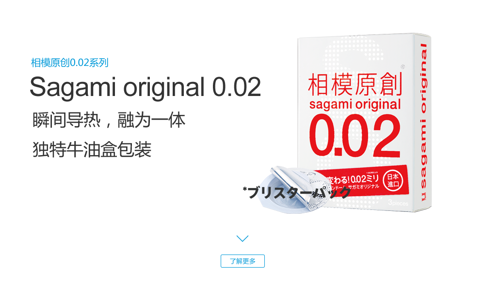 sagami original 0.02 (相模原創(chuàng)0.02系列), 是日本相模橡膠工業(yè)株式會社于1998年推出首次創(chuàng)新發(fā)明并向日本市場的一種以聚氨基甲酸酯 (高分子材料)為原料制成的非乳膠安全套, 厚度僅0.02mm, 是傳統(tǒng)的橡膠產(chǎn)品“厚度一半,強度三倍”, 并且擁有高導(dǎo)熱性能,讓產(chǎn)品使用體驗更加美妙!
